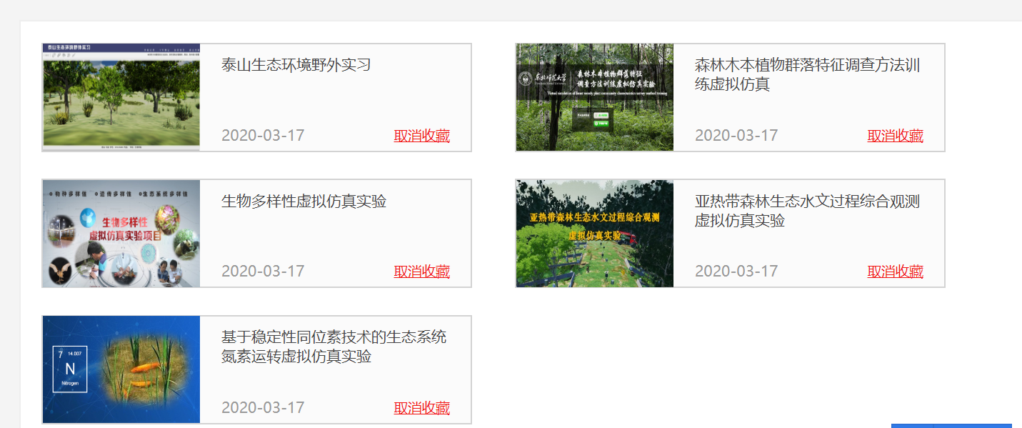 充分利用虚拟仿真实验平台,选择合适的实验项目(见下图,已收藏可选的项目,待分别通过教师实践,再行选择并推荐给学生),并由教师预先完成一轮实验。指导学生注册登录进入实验,按要求完成实验内容,课后巩固以及实验报告,并掌握相应实验的目的、原理、方法。