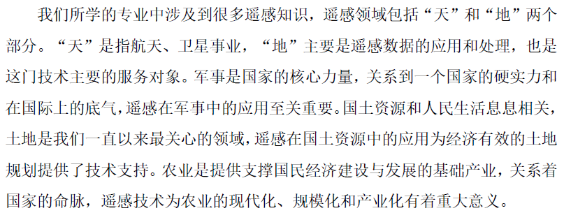 通过讲授专业课程知识,学生对于当今遥感技术发展及应用有了一定的了解。为了提高学生的课程参与度以及独立思考能力,通过布置课程报告的形式,启发学生查阅相关资料,展现近年来我国经济发展、城市化进程以及其他领域的飞速发展,以及卫星遥感技术在这些领域发展中的应用。此外,学生可以更深入的领悟到中国特色社会主义发展所带来的科技的巨大进步,以及对未来科技发展所产生一些思考等。从而推动同学们对课程相关的思政内容有更深刻、全面的认识。