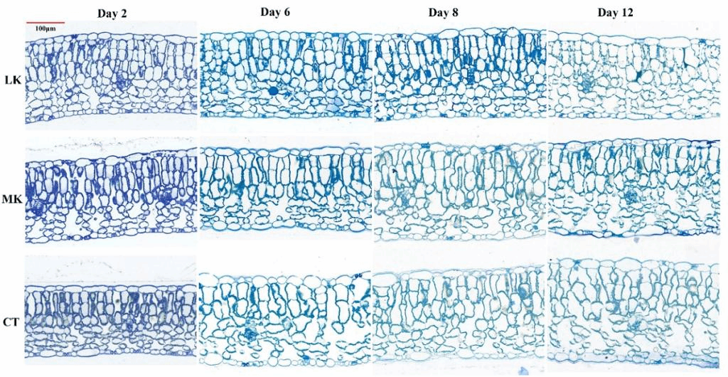 Leaf growth relies on photosynthesis and hydraulics to provide carbohydrates and expansion power; in turn, leaves intercept light and construct organism systems for functioning. Under potassium (K) deficiency stress, leaf area, photosynthesis and hydraulics are all affected by alterations in leaf structure. However, the connection between changes in leaf growth and function caused by structure under K regulation is unclear. Consequently, the leaf hydraulic conductance (Kleaf) and photosynthetic rate (A) combined with leaf anatomical characteristics of Brassica napus were continuously observed during leaf growth under different K supply levels. The results showed that Kleaf and A decreased simultaneously after leaf area with the increasing K deficiency stress. K deficiency significantly increased longitudinal mesophyll cell investment, leading to reduced the volume fraction of intercellular air-space (fias) and decreased leaf expansion rate. Furthermore, reduced fias decreased mesophyll and chloroplast surfaces exposed to intercellular airspace and gas phase H2O transport, which induced coordinated changes in CO2 mesophyll conductance and hydraulic conductance in extra-xylem pathways. Adequate K supply facilitated higher fias through smaller palisade tissue cell density (loose mesophyll cell arrangement) and smaller spongy tissue cell size, which coordinated CO2 and H2O conductance and promoted leaf area expansion.