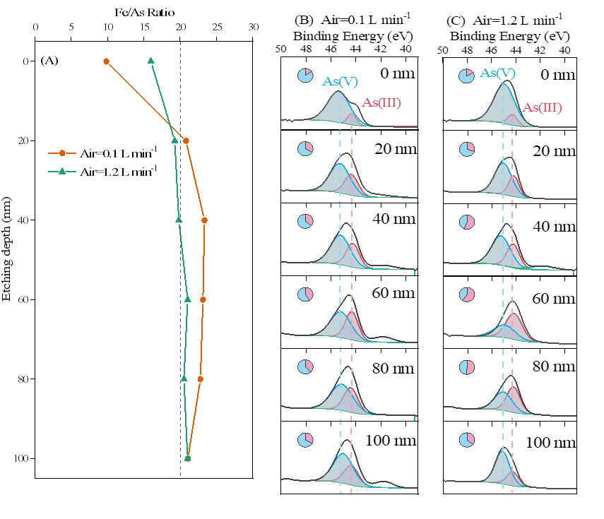 图1 铁氧化物不同深度Fe/As摩尔比(A)及As价态分布(B)(C)
