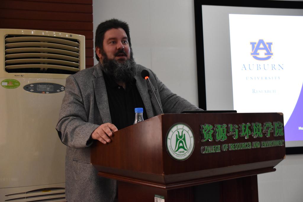 6月12日下午,奥本大学专家团三人做客我校绿博讲坛,在资环楼204会议室给全院师生带来三场生动精彩的学术报告,报告由胡荣桂教授主持,学院杨勇教授、孟冉教授、刘诗诗副教授等多位老师和相关专业的研究生、本科生参加了交流与讨论。奥本大学田汉勤教授也出席了本次报告会。