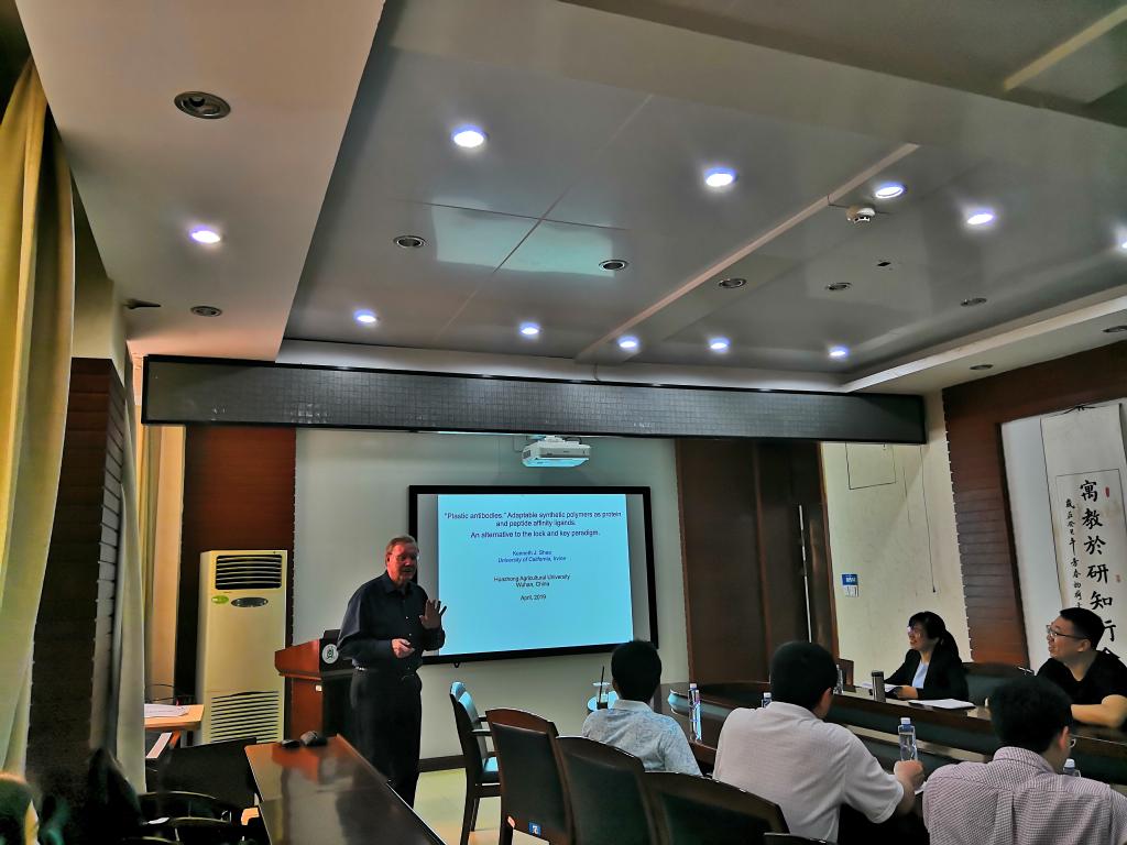Shea 教授主要从事合成有机化学、高分子化学、材料科学以及纳米科学研究,在聚合物仿生亲和材料(塑料抗体)研究方面成果卓著。在为期一周的访问期间,他为资环学院师生作了题为“Plastic antibodies: adaptable synthetic polymers as protein and peptide affinity ligands. An alternative to the lock and key paradigm”和 “Abiotic synthetic polymers: functional alternatives to antibodies? Applications for protein stabilization, inhibition of signal transduction and as broad-spectrum antivenom.”的两场学术报告。报告会由刘名茗教授主持,谭文峰教授、冯雄汉教授、邱国红教授、李胜清教授等不同学院老师及研究生参加了交流与讨论。报告中,Shea教授提出了“塑料抗体(plastic antibody)”的概念,它是一类人工合成的聚合物纳米颗粒水凝胶,其表面具有与目标生物大分子互补的官能团结构。这些水凝胶的独特之处在于,其亲和力可以通过外部刺激,包括温度、pH值和离子强度等开启或关闭,从而实现靶标蛋白、多肽和碳水化合物等的特异性“捕获或释放”。报告中,他详细介绍了“塑料抗体”的合成和筛选策略,并探讨了其在蛋白质分离、检测、稳定以及作为替代抗体药物在毒物螯合和疾病治疗方面的应用潜力。在这些研究中,给人印象最深的是报告中提到的两类聚合物纳米颗粒水凝胶,其中一类对不同种类毒蛇毒液中的毒蛋白均具有螯合作用,能够作为一种广谱型的蛇毒解毒剂,用于挽救众多被毒蛇咬伤而得不到抗蛇毒血清有效治疗的患者;而另一类可以抑制肿瘤血管内皮细胞生长因子VEGF的生长,起到与抗肿瘤药物Avastin具有相似药效的作用,将该类水凝胶与另一种抗癌药Dox联用,则能够取得更好的效果。