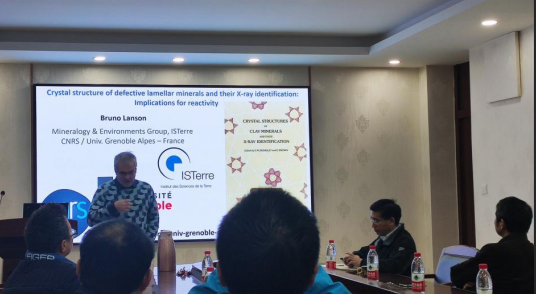 Lanson 教授详细介绍了缺陷层状矿物的晶体结构及其X射线识别对反应性的影响,讲述了多型片段的层间分层、如何用晶体描述非周期结构、缺陷植酸酯的晶体结构、天然土壤样品的X射线衍射定量拟合等内容,并与多位教授对相关学术问题进行讨论。