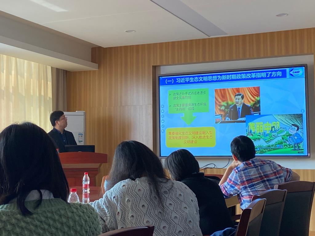 (通讯员:白雪)10月30日上午,生态环境规划院、生态环境政策与管理研究所副所长董战峰研究员做客学院“绿博讲坛”,作了题为“中国‘十四五’生态环境保护政策创新思路与方向”学术报告。经管学院杨福霞,我院蔡鹏、王真、于书霞、宋明伟等师生共计20余人参加报告会,葛小东副教授主持报告会。