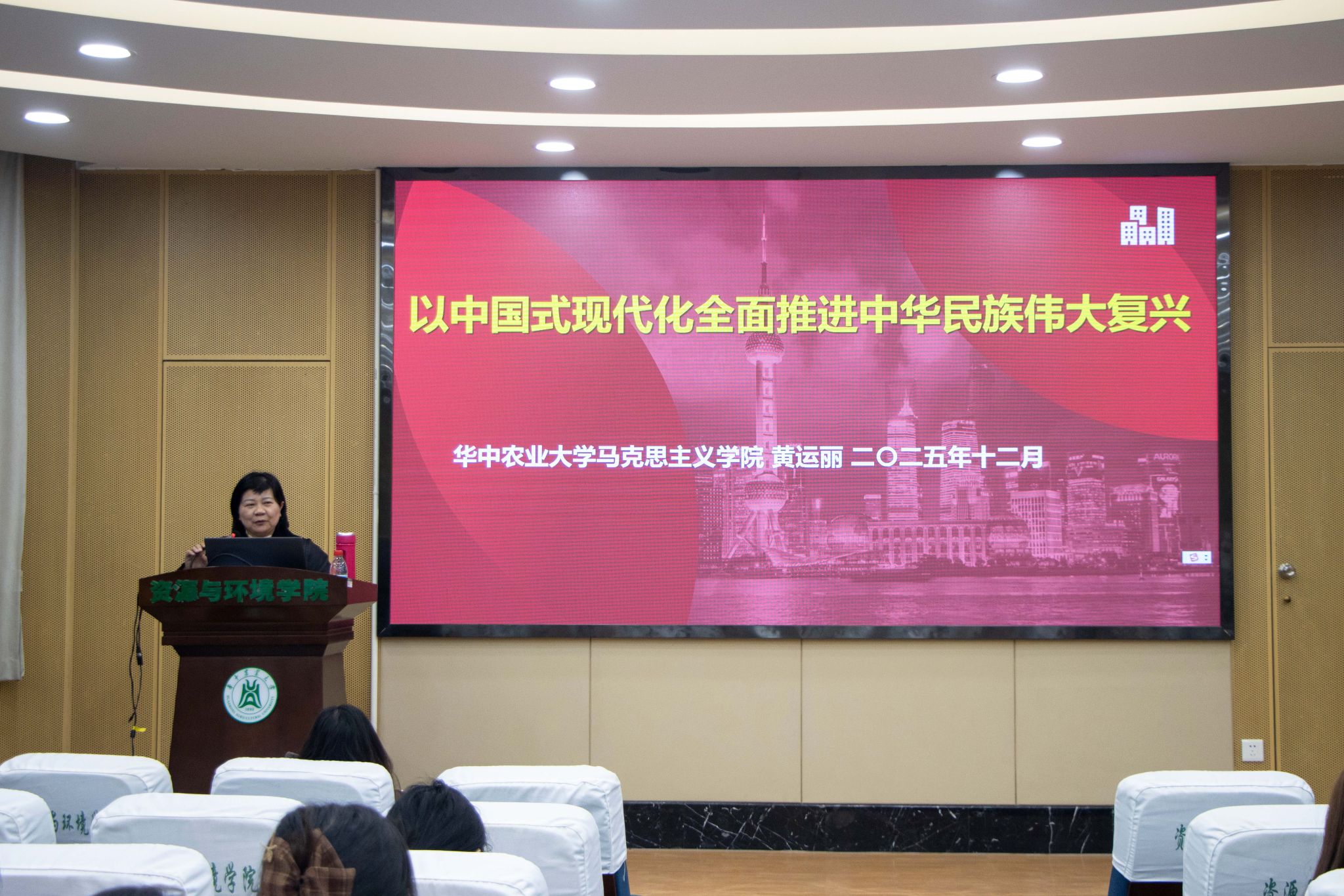 围绕中国式现代化的鲜明特质,黄运丽结合学校涉农学科特色,以油菜无人化种植、智能采摘机器人、无刺武昌鱼育种等农业科技创新成果为例,生动阐释了中国式现代化是涵盖“五位一体”总体布局的“并联式”发展,展现了科技赋能农业现代化、服务乡村全面振兴的生动实践。她通过比较分析,指出中国式现代化坚持走和平发展道路,积极为全球治理贡献中国智慧与中国方案。