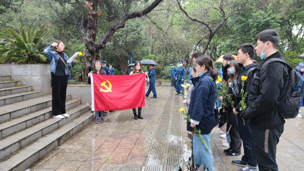拾级而上,大家来到了施洋烈士纪念碑前,齐整队伍,肃立默哀,致敬长眠于此的施洋烈士。随后,全体支部成员高举右拳,在纪念碑前重温入党誓词。宣誓结束后,代表们手持雏菊,依次摆放在施洋烈士墓前,缓步绕行瞻仰革命烈士墓,向革命英烈致以崇高的敬意。