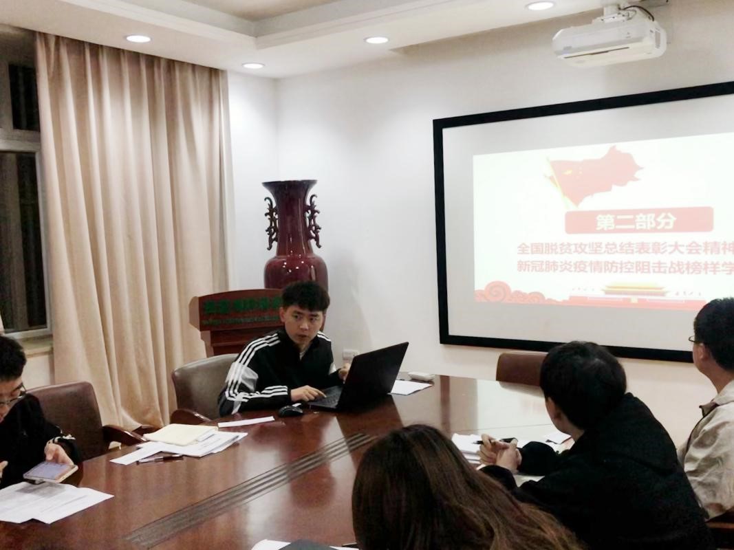 (通讯员 彭珏)324日,水土保持研究生第一党支部召开支部3月主题党日活动,集体学习习近平总书记在党史学习教育动员大会上的重要讲话精神、教育部党史学习教育动员大会上的讲话精神、全国脱贫攻坚总结表彰大会精神。支部杨家伟同志、李念同志主持集体学习,支部全体党员、积极分子参加会议。