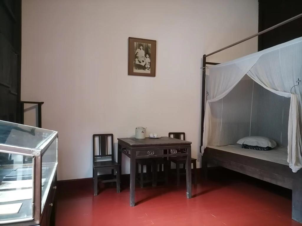 位于前厅左侧的房间,是毛主席和杨开慧的工作室兼卧室。临窗的桌上摆放着一盏煤油灯,毛主席曾伴着昏黄的灯光,写下了著名的《湖南农民运动考察报告》。毛主席住在这里时工作十分繁忙,常在晨曦中走出大门,直到深夜才回家。武昌都府堤41号居住的大半年时光在毛主席一生中弥足珍贵。大革命失败后,毛主席按照党的八七会议指示领导湘赣边界秋收起义。毛主席旧居的简朴让实践团成员们感受到革命斗争的艰难以及毛主席抗战的决心和坚韧不屈的意志,收获到从课本理论中无法获得的热血豪情。