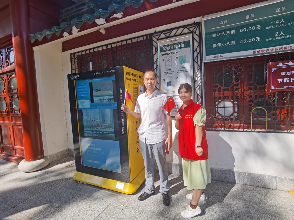 在实践过程中实践团还遇到了来自华中科技大学的博士后,据了解,他来到中山公园主要是为看公司研发的多功能共享流动设备在线下实际应用情况。该名博士后表示,这一设备其主要作用是为游客提供流动的共享充电宝和雨伞拐杖,起到便民利民的作用;除此之外,该设备后续的维护和管理工作还能为更多的人提供就业机会,可谓是一举数得。从博士后的身上实践团成员看到了一批批深耕在基层,善于发现群众需求并通过自己的专业知识解决问题,为人们提供帮助的前辈。作为新时代青年人的同学们更应当以前辈为前进的方向,要有抓得住机遇的眼界、关心民生服务大众的意识,更要有不畏艰难开拓进取的魄力。