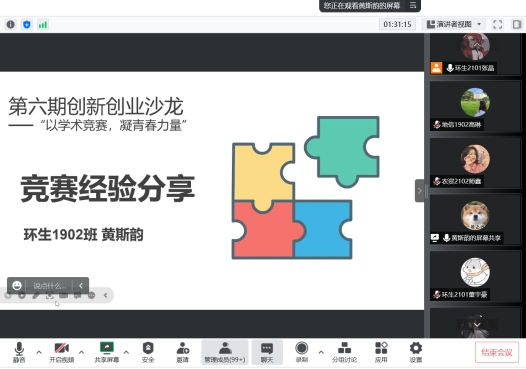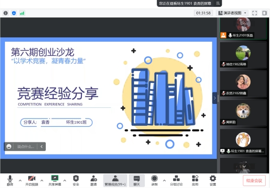 在交流分享换届,环生1902班的黄斯韵从大学生可参与的学术竞赛、自身的竞赛经验与建议以及比赛过程中的心态调整三方面阐述如何参与学术竞赛。在可参与的学术竞赛方面,黄斯韵从自身出发,提及了物理、化学、英语、数学建模、环境生态技能大赛等多种竞赛。接下来,黄斯韵主要介绍了自己参与的湖北省物理实验创新设计竞赛,从头脑风暴集思广益想出优秀创新点,到稳扎稳打制作实验装置,最后书写论文拍摄答辩视频,一整套流程完成一整个实验,并最终获得国赛二等奖。她也鼓励同学们灵活沟通,提高自己的时间管理能力和协调表达能力,参与更多的竞赛。