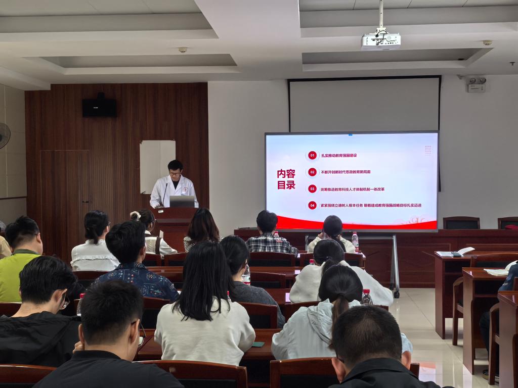 校医院综合党支部组织委员杨晓庆领学习近平总书记《论教育》系列重要讲话内容。他表示,作为一名校园医务工作者,不仅要以高尚的医德、良好的医风履行医务人员职责,更要深刻理解党的教育方针,承担起普及校园健康知识、提高师生健康素养的责任。