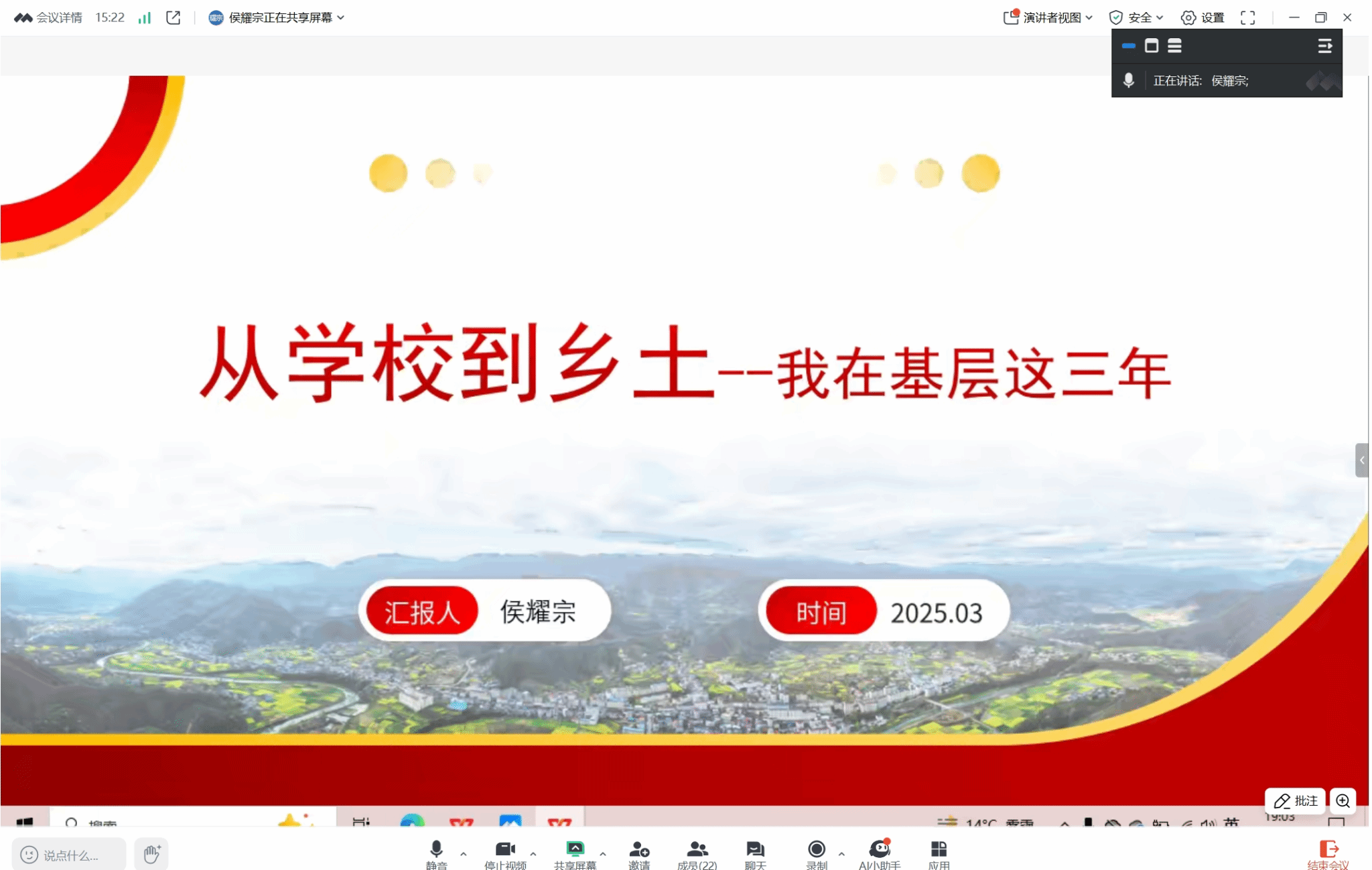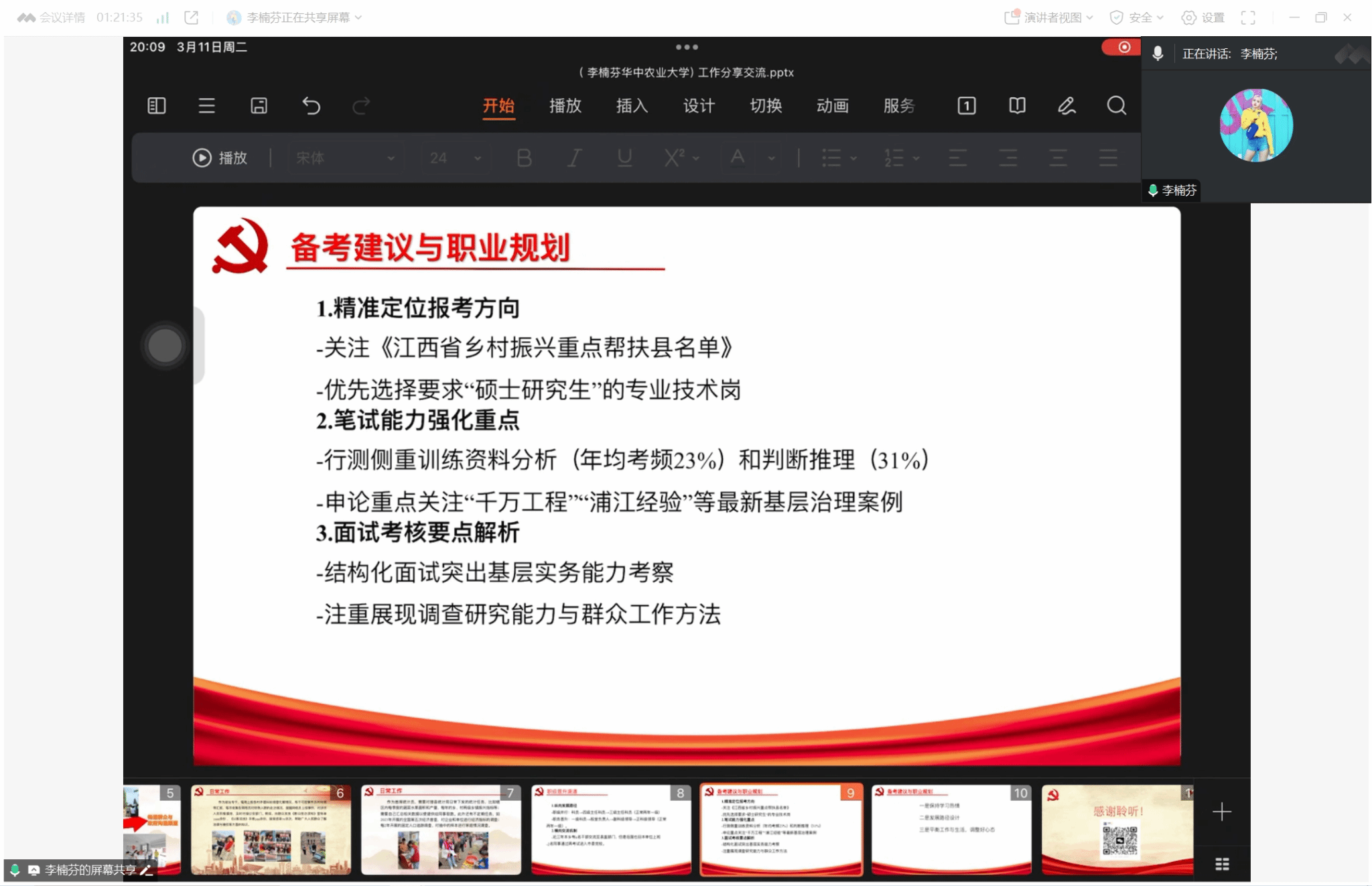为帮助毕业生深入了解基层工作、科学进行个人定位,有的放矢进行就业准备,3月11日晚,学院组织开展了基层就业工作分享会。学院2021届硕士侯耀宗(2021年湖北省选调生,现为襄阳市保康县歇马镇人民政府工作人员),2023届硕士闵艳(2023年湖南省选调生,现为株洲市茶陵县秩堂镇党委秘书、合户村党总支书记助理)、李楠芬(2023年江西省考公务员,现为江西省抚州市金溪县陈坊积乡人民政府党政办干事、综治专干)应邀分享了从校园到乡土的心路历程与工作体悟。