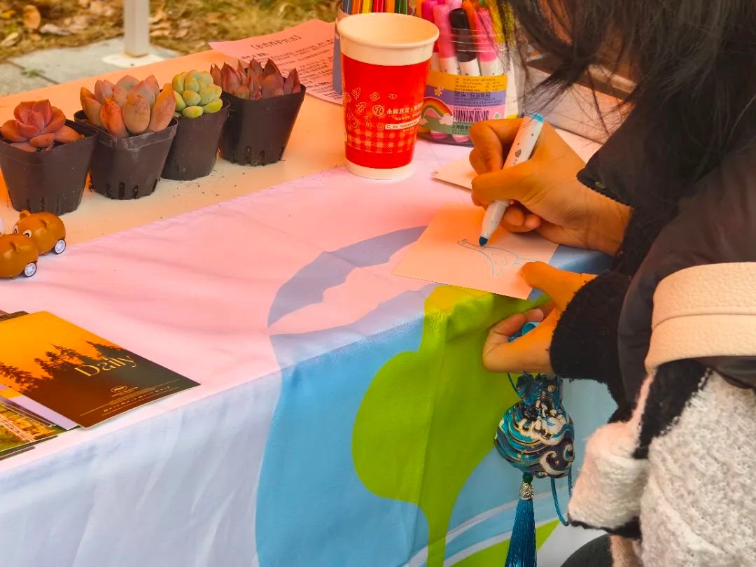 参与活动的同学聚集在摊位前,在科普和实践环节结束后,他们还得到了为环保献力的小奖励——一盆小多肉。大家还纷纷在明信片上留下了自己的环保寄语。"每次给多肉浇水都会想起要善待自然",希望这份绿色能够通过此次活动,更好地传递下去。