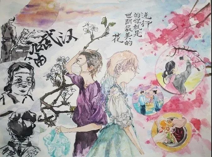 来自农资1802班的陈艺周在此次活动中投稿了多份作品,有诗歌、绘画、书法等。在谈到这些作品的创作灵感时她说:“作为武汉返乡人员,没有参加社区的志愿服务,我便想利用自己在家的时间,通过纸笔,来给抗疫前线的工作者一点精神上的支持和鼓励。”创意设计“武汉必胜”的作者徐梓睿在谈及自己的作品时说道:“2020终将是不平凡的一年,疫情期间,我想用视频图画这种有温度、有情感的方式去记录这疫情下的世界。”