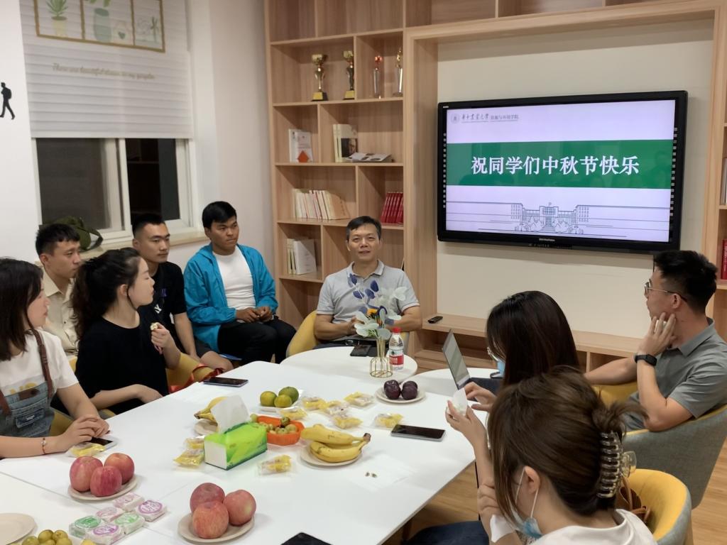 “大家拿着,我们边吃边聊”,谭文峰为同学们递上月饼、水果,现场气氛和谐热烈。“欢迎同学们来到华农、来到资环,祝同学们中秋快乐,并通过你们向你们的家人表示祝福”,谭文峰代表学院向新生致以节日问候,关切询问同学们到校后的日常生活和学习情况。