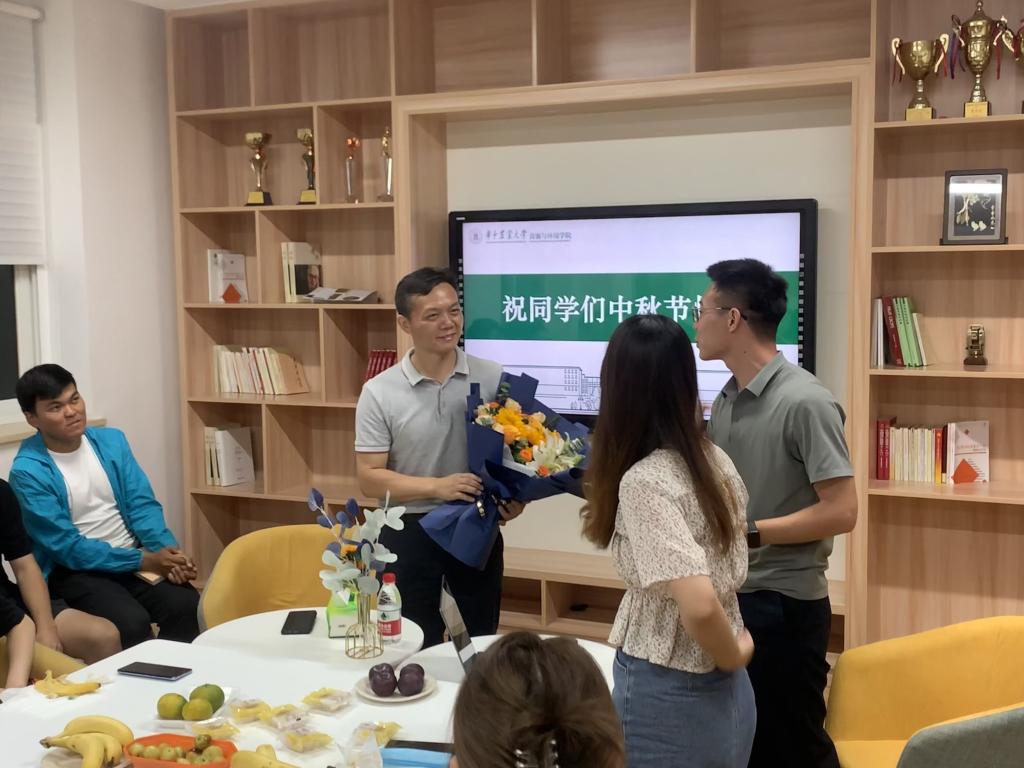 座谈会后,2022级研究生新生刘静为谭文峰老师送上鲜花,代表新生为谭老师送上教师节祝福。“我是一名联培学生,导师不在学校,谭院长嘱咐要专门邀请我们参加座谈,让我们非常感动。中秋节撞上教师节,是阖家团圆的日子,也是教师收获的日子,谭老师抽出时间与我们学生齐聚一堂、共话未来,感动之中更多了敬意,也祝福谭院长和老师们双节愉快”,刘静说到。