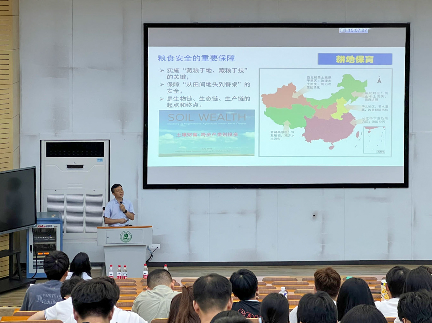 在谈到土壤的重要性时,谭文峰老师强调:“耕地是粮食安全的命根子和农业的基石,耕地地力的提高可以提升粮食产量20%!”他为同学们梳理了历年世界土壤日的主题并深入解读了2022年世界土壤日的主题——“土壤:食物之源”。并以学校牵头的国家重点研发计划专项为例,生动的解释了保护土壤环境与土壤健康的重要意义。当谈到土壤环境政策与策略时,谭文峰老师分享了一系列国家和湖北省的重要文件行动计划及法律法规,并且为同学们介绍了华农在土壤环境领域取得的重大成果和为土壤环境保护治理所处出的贡献。“希望同学们成为建设清洁美丽新中国坚定行动派,成为有社会责任感、自主学习能力、实践创新能力、全球胜任力的新一批创新创业人才。”谭老师还为新同学分享了包括修复平台、修复材料、超富集植物等农田土壤污染修复的研究思路。