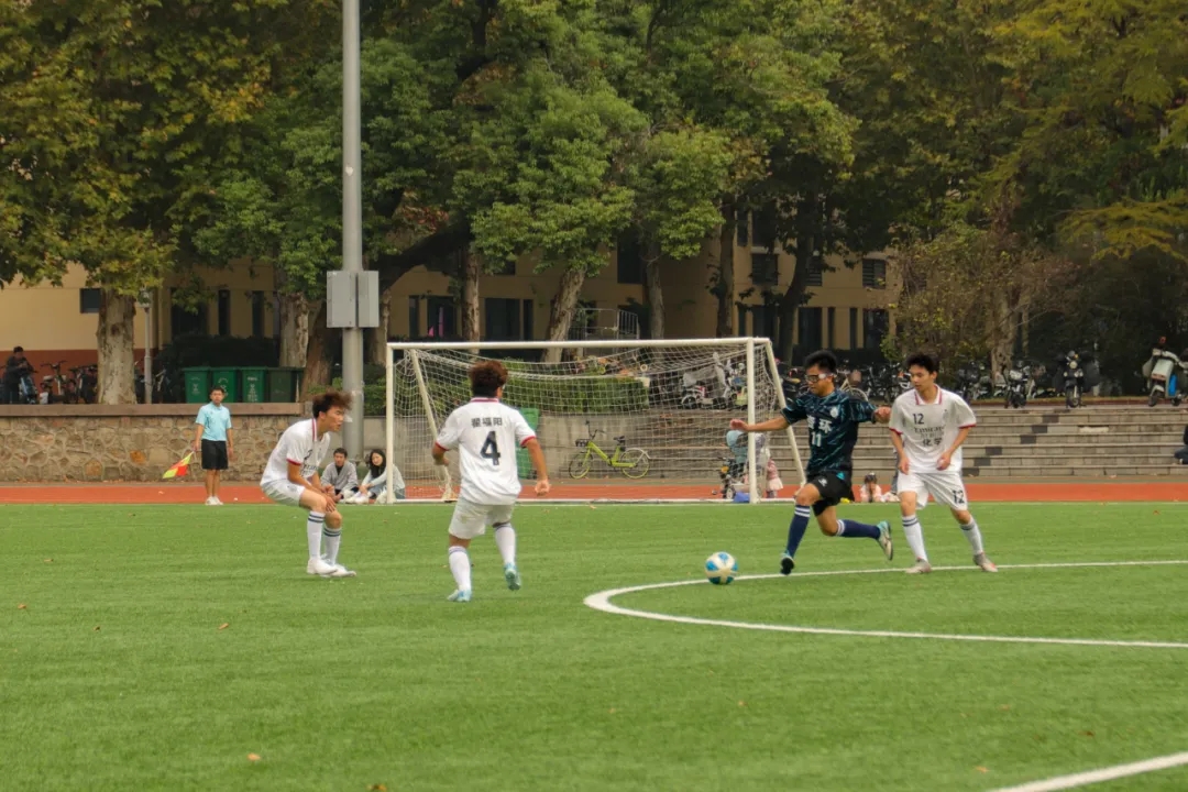 随着主裁判一声哨响,两队开始了激烈的抢拼。开场近三分钟,我院中场球员一脚直塞,李健章顺势接球一记推射成功将球送入球门,瞬间点燃了观看助威的同学们的热情,这也让我院在后面的比赛中一直占据着场上的主动,多次将球带到对方球门附近,给对方造成了很大的威胁。在上半场将要结束的时候,我院的球员们在流畅的配合下将领先的优势扩大到了4 :0。