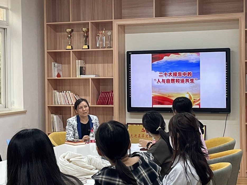 “我是一名已有24年党龄的老党员了,今天很高兴能从‘资环人’的角度一起和大家交流党的二十大精神学习体会”,汪明霞老师言语轻松,瞬间拉近了和同学们的距离。围绕“中国式现代化是人与自然和谐共生的现代化”这一重点,汪老师从四个方面回答了作为一名资环人,如何推动绿色发展,促进人与自然和谐共生。