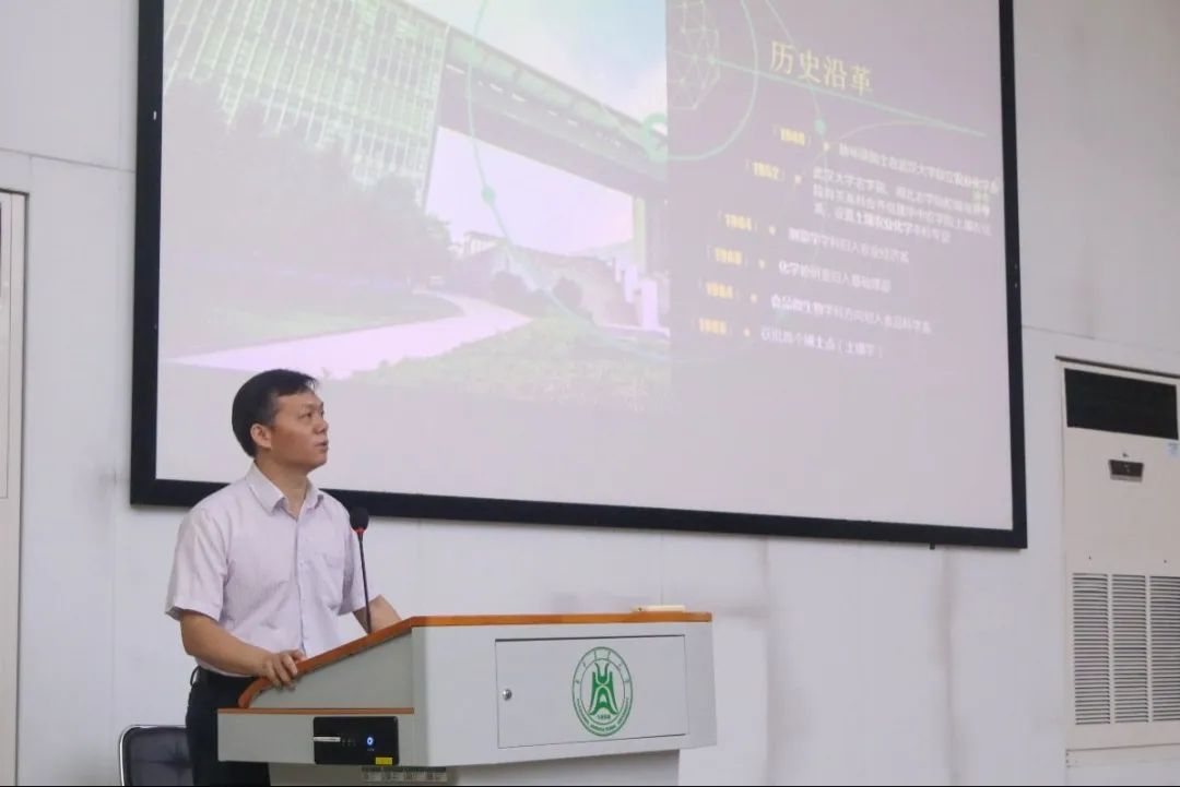 谭文峰首先介绍校情院情。他讲述了我院80年代至今涵盖的专业的变化,表示“资环人不断学习创新,与时俱进,是学校事业发展重要的学科增长点”,从历史沿革、人才培养、师资队伍、科学研究、合作交流等方面系统地讲解了我院基本情况。在谈到我院发展的新机遇时,谭文峰特别指出我校参与省三普组织机构组建,我院共有国家级三普专家3人、湖北省三普领导小组成员1人。最后他寄语新生:“希望未来在田间地头也能看到你们的身影。”
