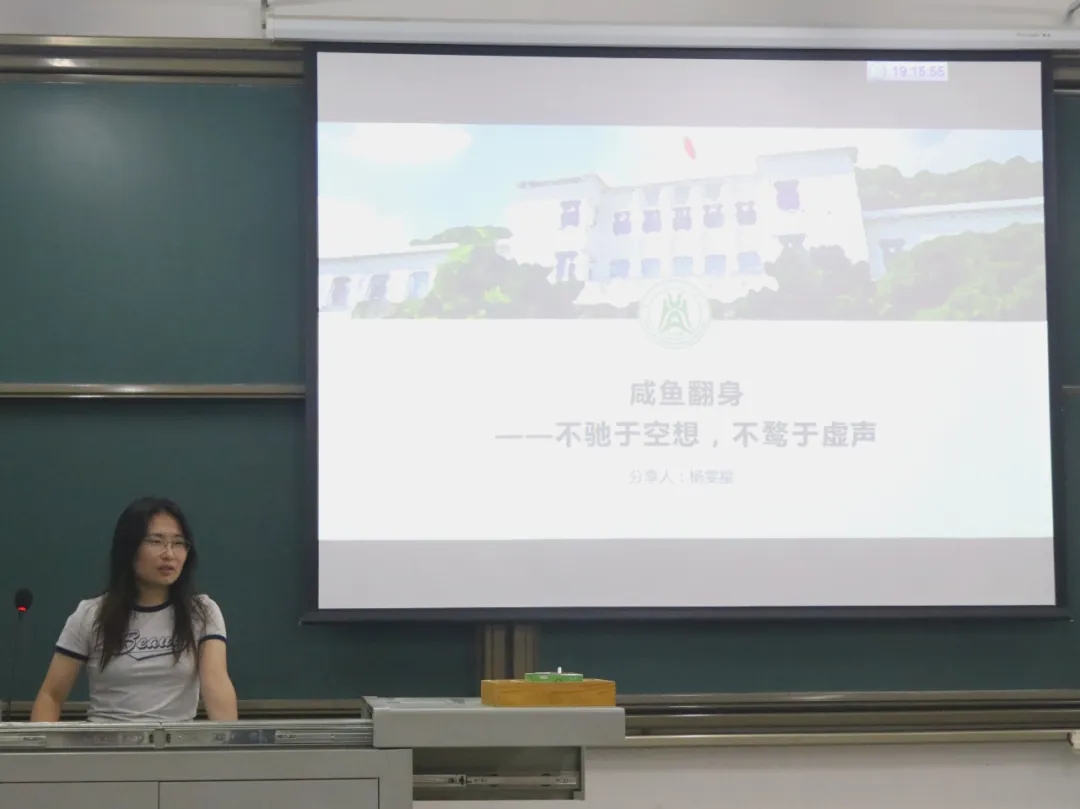 不驰于空想,不骛于虚声。杨雯星以“咸鱼翻身”为主题向同学们倾情分享自己的科研经历以及从中吸取的经验和教训。万事开头难,确定目标是首要。其次,实验记录本的书写是中期考核和终期考核中值得费心思的重点,科研中一切努力的痕迹都能在详尽的实验记录本中展现。“成绩在后面一点的同学要加倍努力,成绩在前面的同学也要有危机意识。”她以真实案例向同学们提出警醒。