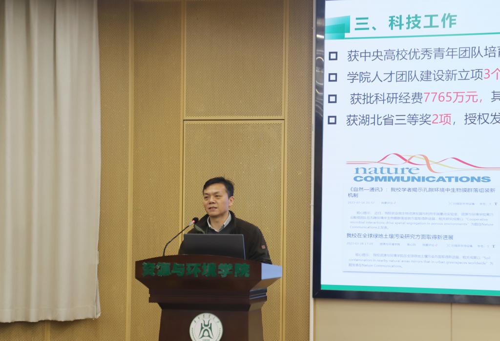 院长谭文峰首先对学院2023年度工作进行总结汇报,他谈到,2023年在全体教职工的共同努力下,学院各项工作全面推进,众多项目取得了突破,并从党建与思想政治工作、人才培养、科技工作、学科建设、社会服务、国际合作与交流、人事人才、离退休与群团工作、文化建设与师生融乐、平安校园与绿色校园等方面进行了报告。