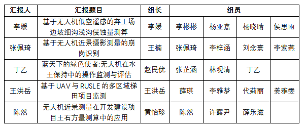 比赛现场,五支队伍依次进行汇报和答辩,其中“基于无人机低空遥感的弃土场边坡细沟浅沟侵蚀量测算”项目基于无人机低空遥感对弃土场的影像,进行边坡细沟浅沟的识别,并计算出了弃土场的侵蚀量;“基于无人机近景摄影测量的崩岗识别”项目展示了他们对崩岗的研究过程,详细阐述了崩岗的分类;“蓝天下的绿色使者:无人机在水士保持中的操作监测与评估”项目小组对三个监测区域进行了实地调查,并使用无人机获得影像进行分析;“基于UAV与RUSLE的多区城梯田项目监测”项目对多区城梯田利用UAV与RUSLE 进行了全面的思考与详细的计算;“无人机近景测量在开发建设项目土石方量测算中的应用”项目对无人机所获得的影像进行了点云图、三维模型、DEM数据的输出,并利用所得数据进行土方量的计算,进一步分析了无人机近景测量在精度和时效性等方面对水土流失监测领域的适用性。