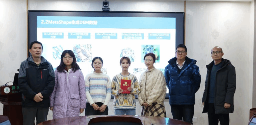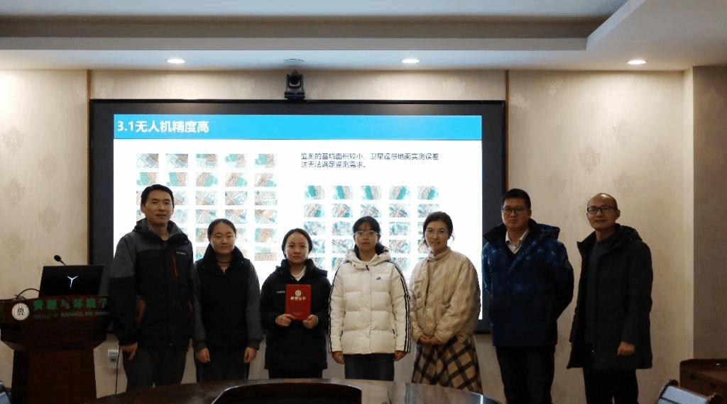 各组成员展示后,评委老师对各组监测项目进行提问与点评,并对各组参赛成员在监测准备、监测实施和监测成果总结等各个方面提出了建议。最终评选出竞赛获一等奖的项目为“无人机近景测量在开发建设项目土石方量测算中的应用”,获二等奖的项目为“基于无人机低空遥感的弃土场边坡细沟浅沟侵蚀量测算”,获三等奖的项目为“基于无人机近景摄影测量的崩岗识别”、“蓝天下的绿色使者:无人机在水士保持中的操作监测与评估”、“基于UAV与RUSLE 的多区城梯田项目监测”。随后,各位评委老师对获奖队伍进行颁奖,并与同学们合影留念。