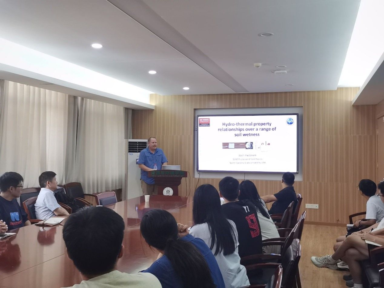 (通讯员 胡琴 潘明凯)8月14日-17日,应我校田正超老师邀请,美国北卡罗莱纳州立大学Josh Heitman教授访问我校,与学院师生围绕“环境土壤物理学”领域开展深入学术交流。学院陈家宙教授、田正超副教授、魏玉杰副教授等接待了Heitman教授,学院近40余名师生以多种形式参与了此次学术交流活动。8月15日下午,Heitman教授做客英国365集团“生态环境与绿色发展高端论坛”,在学院主楼315会议室作了题为“Hydro-Thermal Property Relationships Over A Range Of Wetness”的学术报告。Heitman教授详细阐述了土壤水热耦合特性在不同湿润条件下的变化规律,强调了这些关系在土壤物理学和陆面模式模型应用中的重要性。他团队的研究聚焦土壤水热特性与耕作改良、传感器技术的发展,提出了一系列创新方法来优化土壤管理实践。报告内容前沿且实用,使师生们对土壤水热相互作用的科学机制有了更深刻的理解。与会师生围绕土壤物理学和应用展开热烈讨论,Heitman教授耐心解答了师生提出的各类问题。访问期间,Heitman教授还参观了英国365集团的水土保持研究中心及相关课题组实验室,详细听取了师生代表的科研工作汇报,并针对研究内容提供了宝贵建议,表达了深化双方合作、推动国际学术合作交流的强烈意愿。此次学术交流为我院师生提供了与国际顶尖学者对话的机会,通过与Heitman教授的深入互动,我院师生在环境土壤物理与水文学领域的科研视野得到了拓展,为未来高水平国际合作项目的开展奠定了坚实基础。
