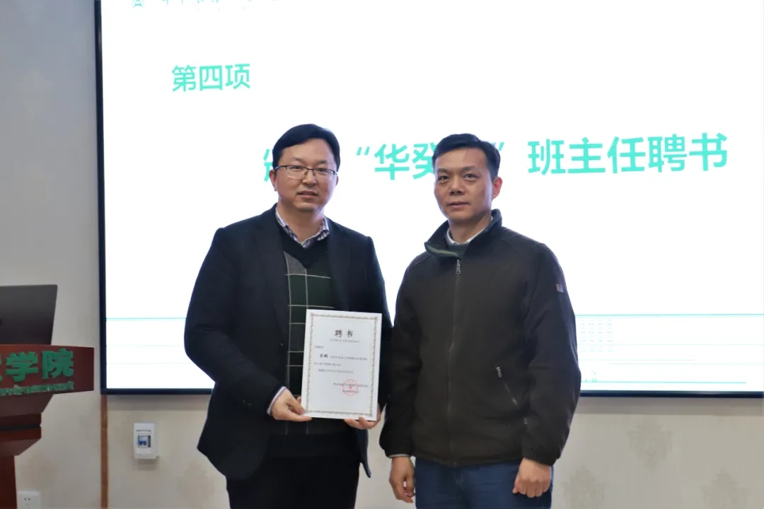 谭文峰分别为“华癸班”导师代表和“华癸班”班主任蔡鹏颁发聘书。蔡鹏作为此届“华癸班”的班主任进行发言。他幽默诙谐的借用西天取经的故事向同学们强调了成长过程中同行人员的重要性,并对同学们提出了三点要求。一是坚持创新驱动,围绕“大生态,大环境,大健康”进行研究,不断实现从“有创意”到“有创新”的转变。二是提升综合素养。从小事开始学习,重视个人综合能力的提升。三是久久为功行稳致远。他鼓励同学们如竹子一般向上生长。