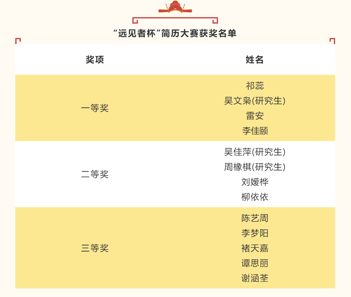 五月下旬2021年“远见者杯”全国大学生创新促进就业(简历设计)大赛落下帷幕。本届大赛秉持着“鼓励创新、促进就业,贴近实战、注重实效”的宗旨,依据参赛作品所体现的学习经历、特长专长、发展潜力等要素与求职意向匹配度作为主要衡量标准,经过一个多月的评选及总决赛评审,最终我院取得了一等奖四名,二等奖四名,三等奖五名的优异成绩!
