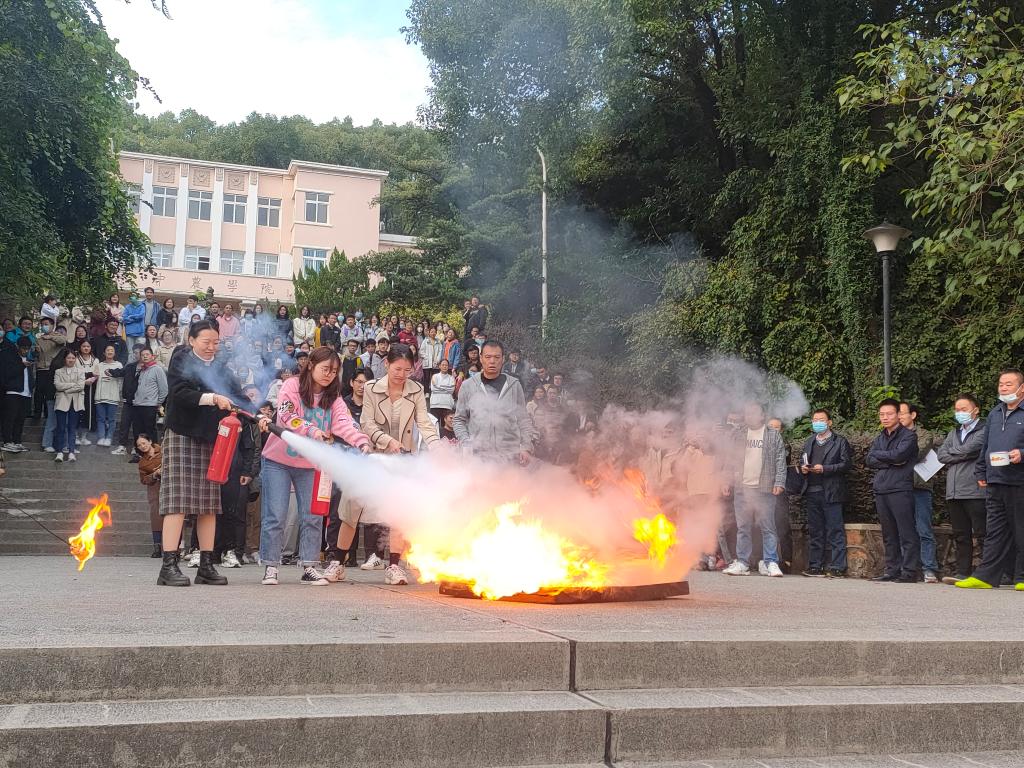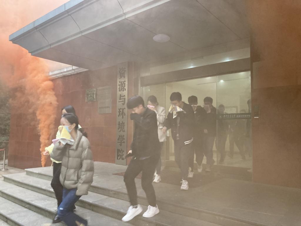 16时50分许,资环楼内浓烟四起、警铃大作,模拟火灾发生实景,资环楼“着火了”!楼内师生低头弯腰、用湿毛巾捂住口鼻,按照事先规划疏散路线从资环楼西门、北门有序撤离至主楼前台阶。随后,校园建设与安全保卫部工作人员在主楼前进行灭火器使用讲解培训,在场师生根据指引进行灭火器灭火实操演练。