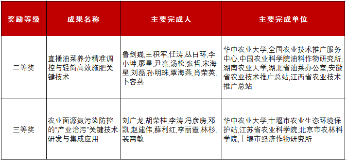 由鲁剑巍教授等共同完成的“直播油菜养分精准调控与轻简高效施肥关键技术” 获评科学研究类成果二等奖,该项目对油菜氮磷钾硼镁养分调控原理、精准高效施肥技术体系和系列专用肥料新产品等方面做了具体说明;由刘广龙副教授等共同完成的“农业面源氮污染防控的‘产业治污’关键技术研发与集成应用”获评科学研究成果三等奖,该项目通过长期的、系统的研究,弄清了面源污染氮素的主要来源、形态及输移途径,以氮资源循环利用为核心,研发了村镇生活污水和沼液的稻田安全净化技术,集成了生态种植串联沟渠塘堰的立体消减技术和多级循环粪污全消纳的种养结合技术,构建了农业产业链面源氮素的高效利用技术体系。