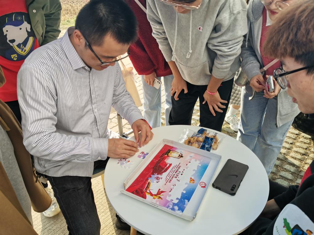 在“星星之火 可以燎原”游戏点,零散的拼图象征着革命的星星之火,在同学们的极速拼接中迅速发展成燎原之势。完成拼图的刘新伟老师不禁感叹,百年大党,从弱小到强大、从幼稚到成熟,带领我们国家民族从落后挨打走向民族复兴,新时代的我们没有任何理由歇一歇、等一等,民族复兴征程中同学们正是年富力强,这是历史性的必然结合,希望大家进一步坚定理想信念,增加学识本领,立足专业许党报国。
