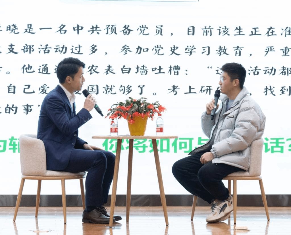 谈心谈话环节,参赛辅导员就抽签主题模拟与学生谈话的场景。甄诚了解到学生党员参加支部活动热情不高后耐心开导,他谈到,“梦想从学习开始,事业靠本领成就”,作为一名预备党员更应发挥模范带头作用,要用习近平新时代中国特色社会主义思想武装自己,先学一步、学深一步。