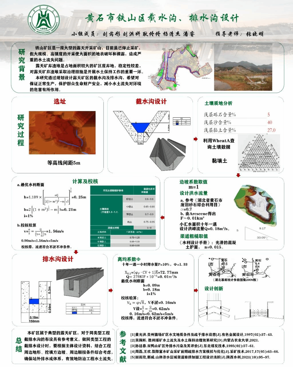 “黄石市铁山区截、排水沟设计方案”项目通过规划设计露天矿区的截水沟及排水沟,希望对保证正常生产,保护群众生命财产安全,减小水土流失对环境的危害有所作用。设计区属于典型的露天矿区,学生根据主体设计资料,结合工程周边地形、挖填方边坡、周边条件综合考虑,确保排水工程成体系。这对于同类型截排水沟工程的布设具有指导意义,可有效地防治工程水土流失。