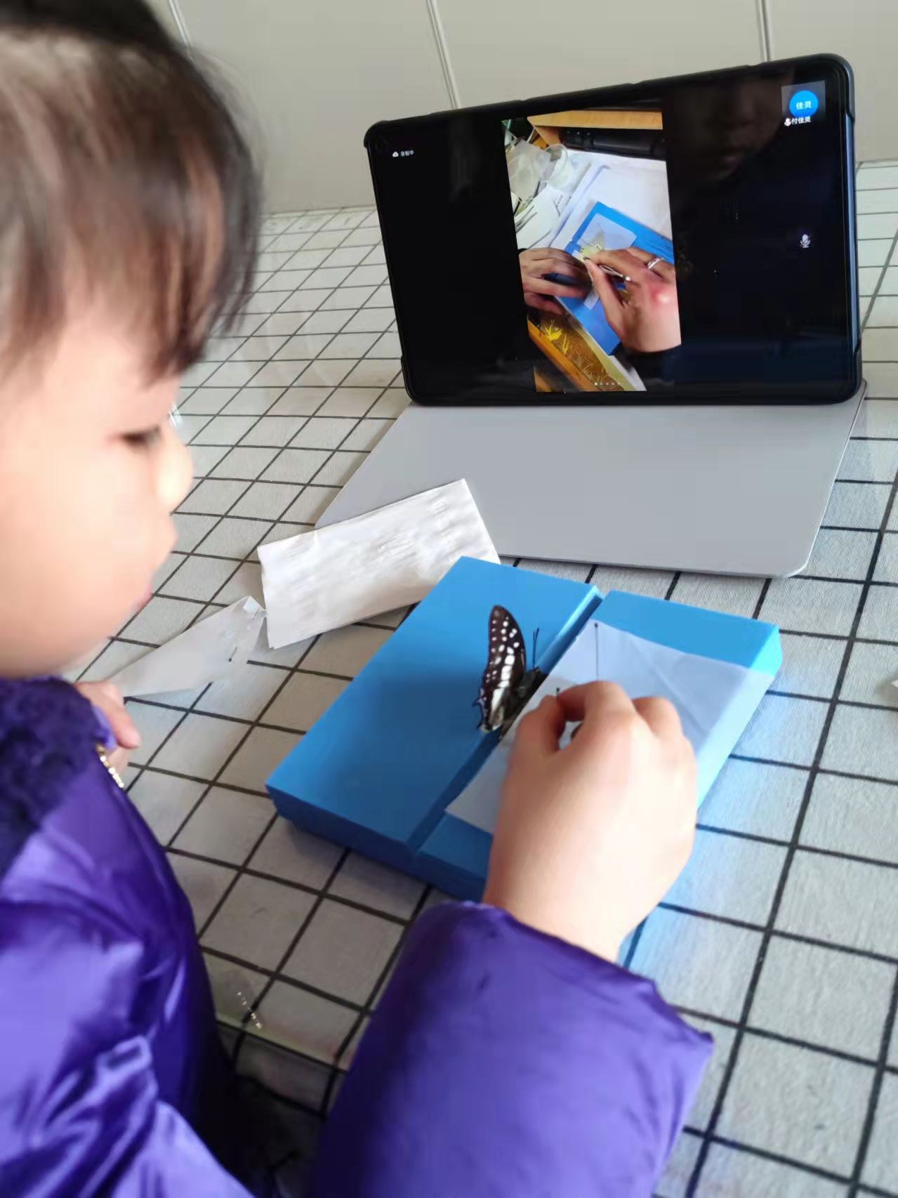 付佳灵小朋友在课程中积极回答老师提问,第一时间做好蝴蝶标本,并清楚分辨出昆虫的种类,她说:“我的蝴蝶标本是凤蝶科的蝴蝶,特点是有长长的尾突,是一个漂亮的蝴蝶。”