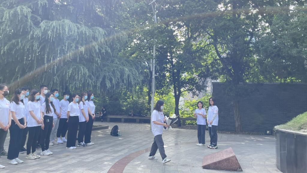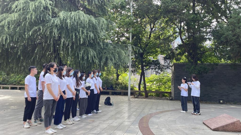 随后,大家一同前往施洋烈士陵园,瞻仰缅怀革命先烈,学习了解革命历史。施洋烈士陵园主要由施洋烈士塑像、纪念二七惨案的27级台阶、纪念碑和施洋墓组成,为纪念因京汉铁路大罢工而光荣牺牲的律师施洋而修建。在施洋墓前,学员蔡青青、孙雨欣讲述时代背景及施洋烈士生平,学员代表张紫荆为烈士鲜花,全体学员绕墓一周寄托哀思并在墓前肃穆默哀。默哀结束后,胡志宏分享了约翰·亚当斯的名言:我必须研究政治和战争,这样我的儿子们才会拥有研究数学和哲学、地理、博物、造船、航海、商业和农业的自由,他们的孩子才能拥有研究绘画、诗歌、音乐、建筑、雕塑、织艺和陶瓷的权利。他说,这段话直接而清晰的讲明一代人有一代人的担当、一代人有一代人的使命这个道理,以施洋烈士为代表的前辈们完成了他们的使命,历史的接力棒不可更改的交到了我们手中,希望此次主题团日能淬炼大家请党放心、强国有我的豪情与担当。