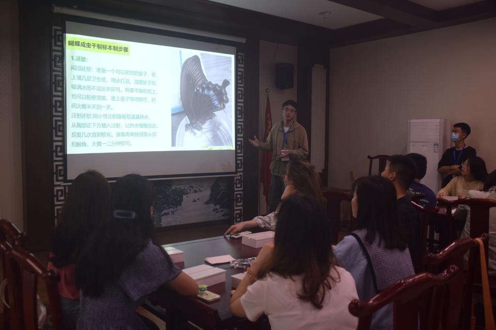 “这只蝴蝶为什么像一只猫头鹰啊?”来自信工学硕班的唐琪提出疑惑,“这是一种警戒色,它的作用有几种说法,”绿色协会志愿者何星毅介绍到“其一是像螳螂等掠食动物喜欢首先攻击猎物的头部,眼斑一般位于后翅,如果受到攻击发生损坏,其完整的前翅仍然可以使其飞离危险;其二是则是欺骗捕食者,通过‘凶狠’的外表吓退敌人,而这只蝴蝶的名字就叫‘猫头鹰环蝶’。”除了猫头鹰环蝶,光明女神蝶,塞浦路斯闪蝶、宝石金龟等展品引得同学们纷纷驻足欣赏。随后,参与活动的每一位同学领到了专属的标本制作套装,在志愿者刘如达进行了世界地球日的主题科普及标本制作技巧引入后,同学们便在工作人员指导下开展了专属自己的标本制作体验,展翅固定、样本烘干、固定装框,同学们小心翼翼定格着自己手中的美丽,在一番操作后,每一位同学都获得了自己亲手封装的标本。“出于对制作标本的浓厚兴趣报名参加了本次活动,这种定格地球美好的寓意让我感到非常有趣,经过亲手操作体验,我对于蝴蝶标本的制作原理、方法及小技巧都有了一些认识,每一种生物都扮演着独一无二的角色,希望大家能爱护地球、守护身边的美好。”参与者唐念念在活动结束时谈到。
