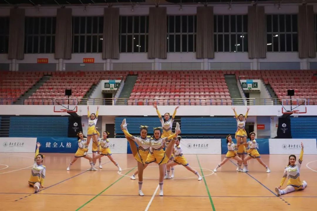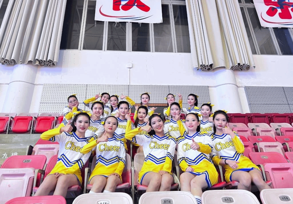 比赛现场,大家迈着整齐的步伐走入表演场地。一声“散”的口令下达,大家急速跑到自己的位置高举双手做好准备,巧妙的队形编排和技巧动作的结合让队员们的表演十分精彩。在开场自编动作中,她们融入了“侧手翻”、“叉跳”、“拉丁转”,在结尾处融合了“一字马”、“搬旁腿”和托举等动作,场下观众欢呼雀跃,队员们的表演也得到了评委们的表扬和肯定。整齐划一的亮黄色服装、高梳的马尾、欢快的节奏和运动员脸上灿烂的笑容展现着资环风采。她们是资环的骄傲,她们的精神值得我们去学习。