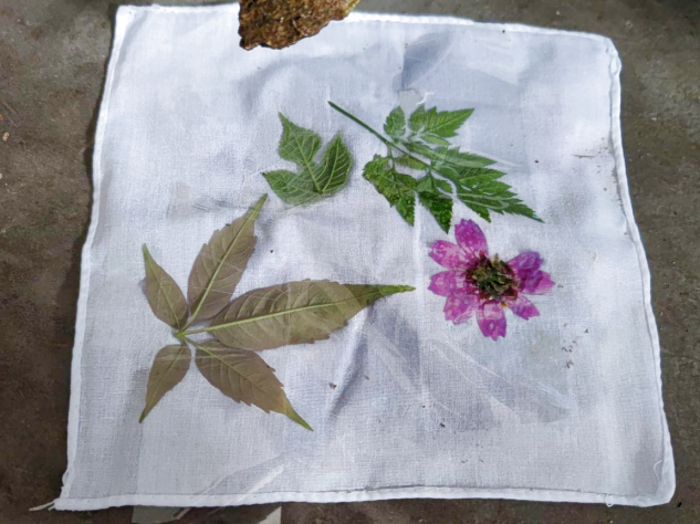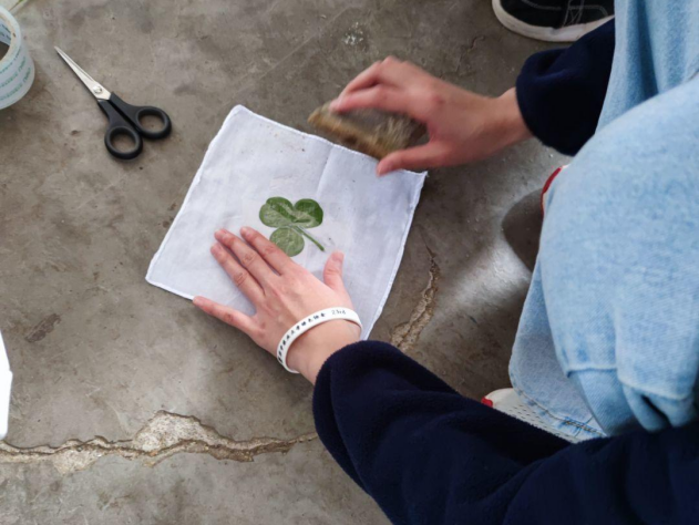 4月30日,志愿者在清晨的第一缕阳光中启程,抵达目的地彭家湾。微风是一个不请自来的客人,志愿者便动手一起制作了风铃,风铃悦耳,在茶谷中回荡着自然之声,有塑料瓶身微微碰撞的声音、鸟儿清脆的啼叫、风吹过茶树的沙沙声……沉溺于这样的声之境里,感受自然的瑰丽伟大而又神奇莫测,细细聆听,方能寻求它无言的启示。志愿者用拓印的方式留下了自然之美。一方洁白手帕里包罗了自然之美,有象征幸运的四叶草、有各色各样的树叶、有斑斓绚丽的鲜花,拓印与自然交融。