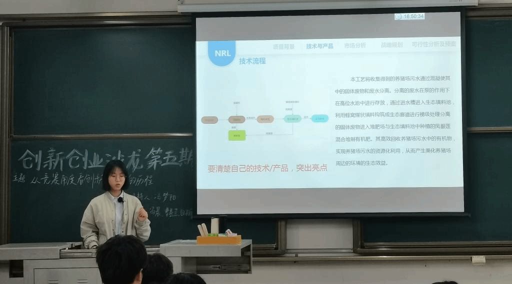 环工1901班曹芸芸分享了她获得“互联网+”参赛项目:净水益农——低费治理养猪废水,她通过项目背景、技术产品、市场分析、战略规划、可行性分析及预案等方面介绍了她的创新创业历程,基于学院专业优势,打造创新型产品,参与创新创业竞赛。