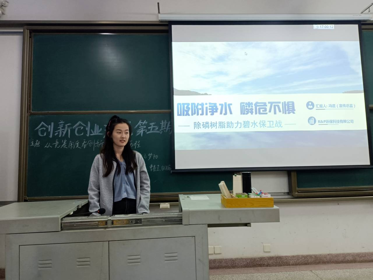 在分享环节,环生1901班冯晨首先结合自身经历,为大家介绍了她所在团队的互联网+项目——吸附净水,磷危不惧,她从现实难题、行业痛点、公司核心技术、同类产品对比、盈利预测等方面展示创新创业竞赛项目的实际案例。
