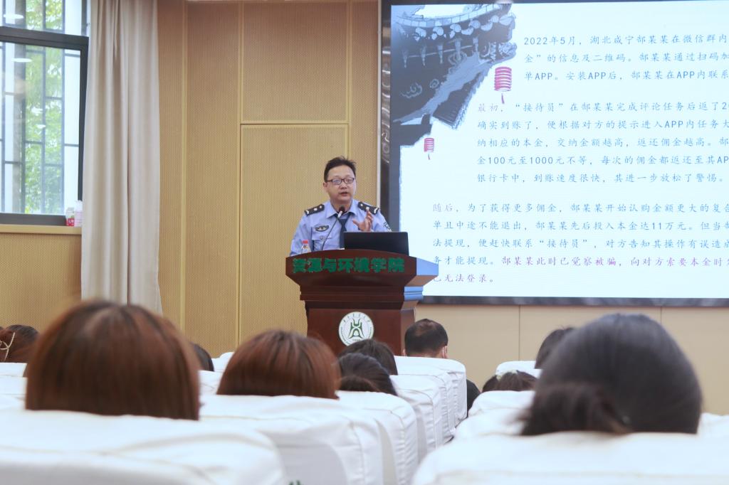 为进一步加强我院学生各项安全教育工作,切实落实好安全防范教育,预防和减少电信诈骗的发生,我院于5月11日在西附楼报告厅开展了主要学生骨干及寝室长安全教育培训,南湖派出所民警郭锋、周毅、辅导员艾力·斯迪克、汤春燕参加了本次培训。郭锋警官为大家作防诈骗分享。
