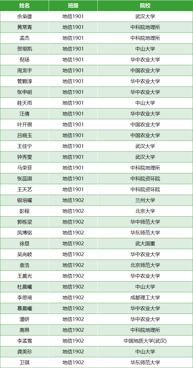 经统计,截止5月20日,2019级本科生共计322人,升学人数(境内)183人,占比56.83%,国(境)外升学11人。其中地理信息科学专业升学(境内)共计33人,详情如下: