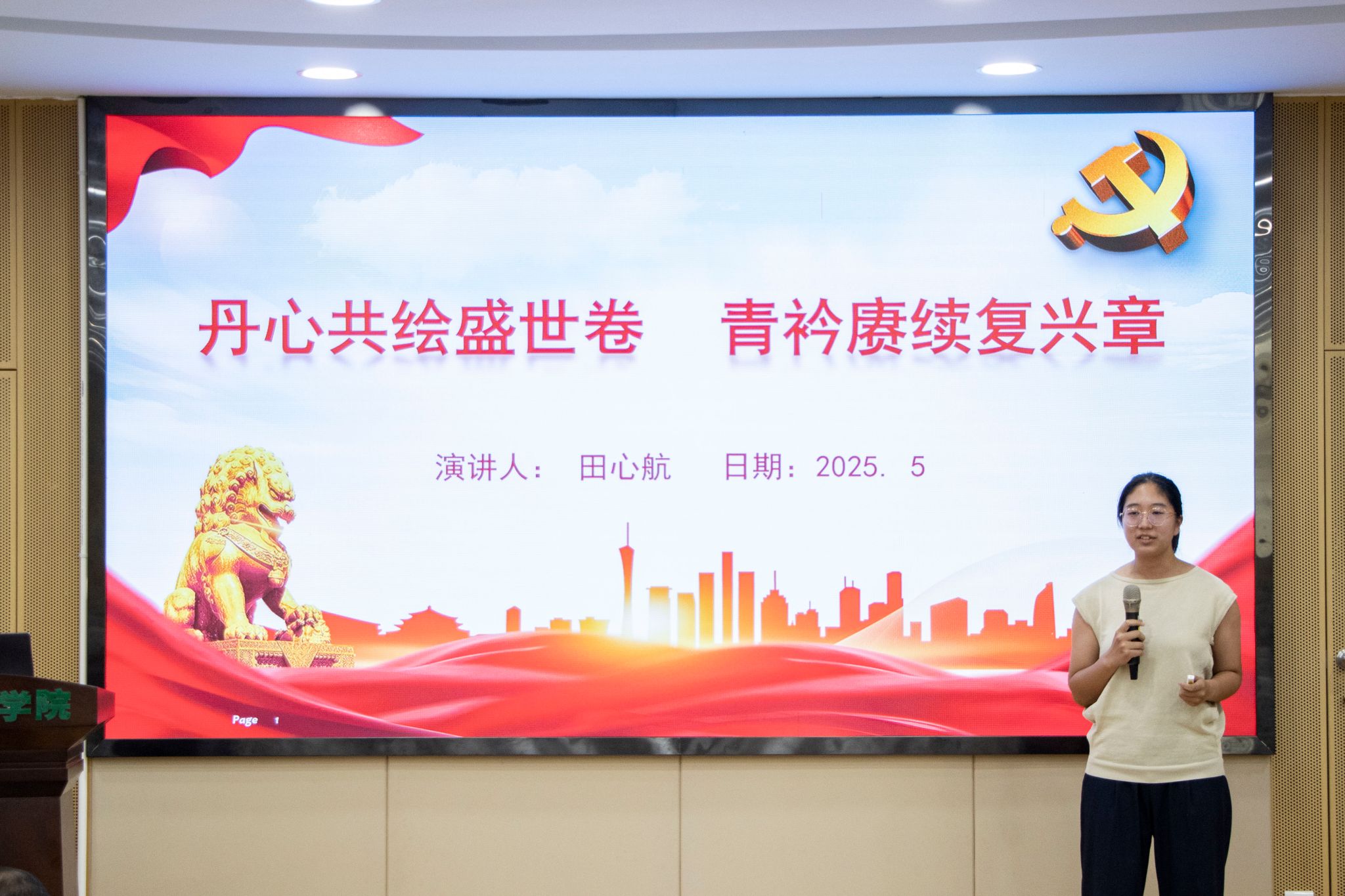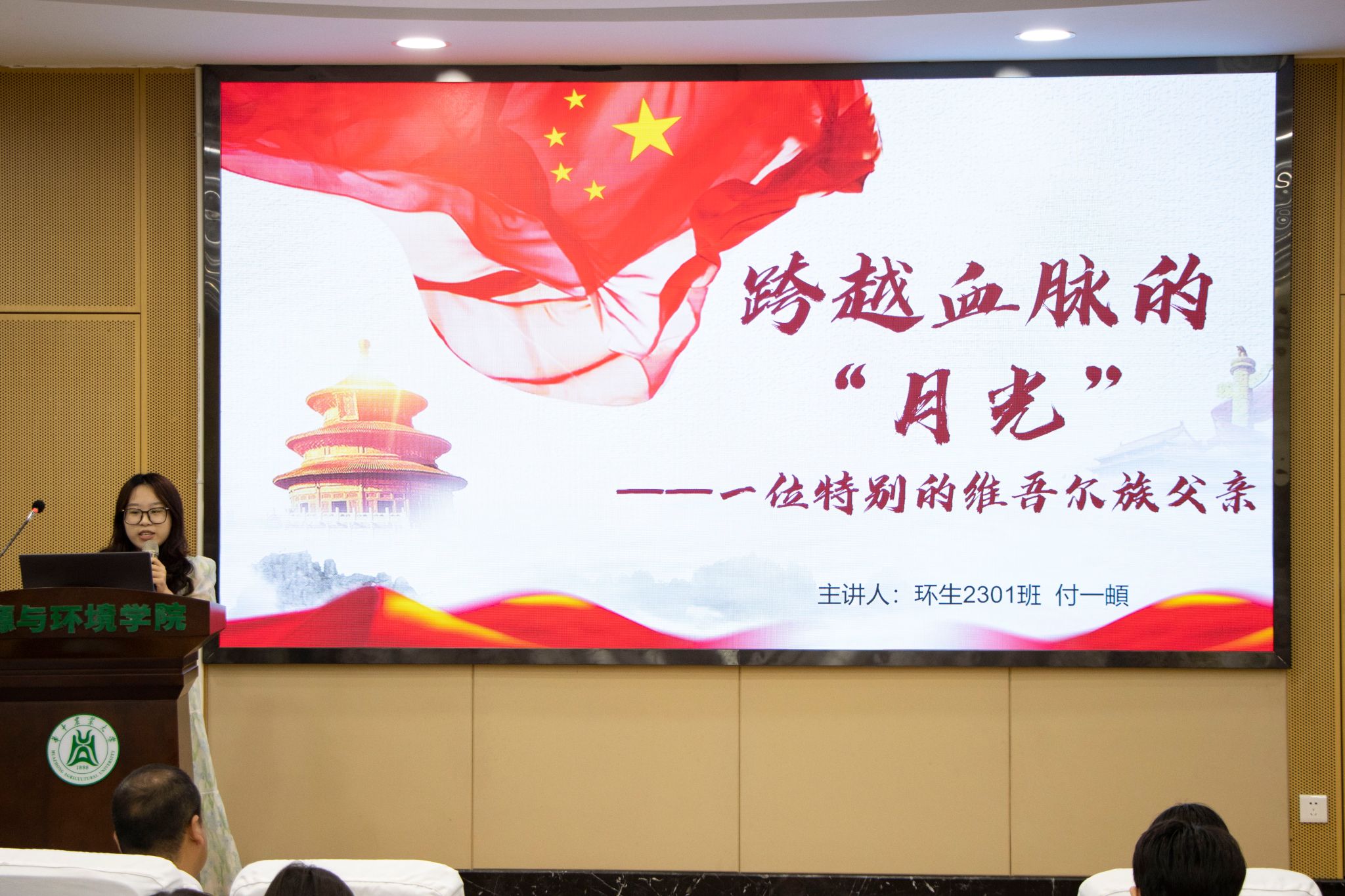 以《跨越血脉的月光》为题,环生2301班付一頔分享了维吾尔族老人阿布力孜·努来克跨越民族大爱的感人故事。付一頔呼吁新时代青年以阿布力孜为榜样,在日常互动中践行“石榴籽”般的共同体精神,共同托举中国梦的璀璨未来。