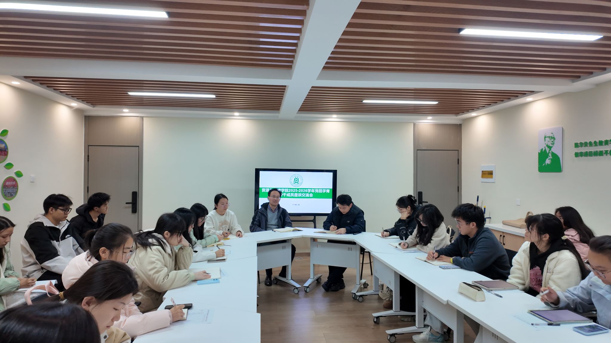 2025年12月11日晚,资环学院于学生一站式社区举行2025 - 2026学年团学组织学生骨干座谈会,共同研讨学生工作,学院党委副书记熊海林、辅导员何超、汤春燕以及30余名学生骨干参会。
