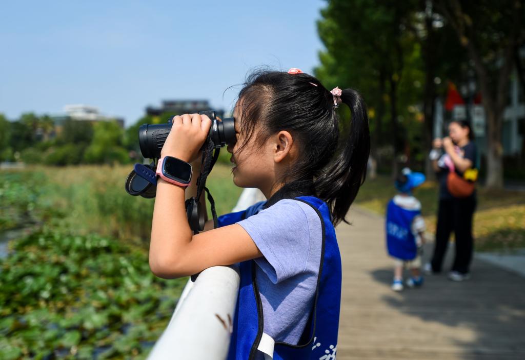 小朋友在公园观鸟。记者许魏巍 摄