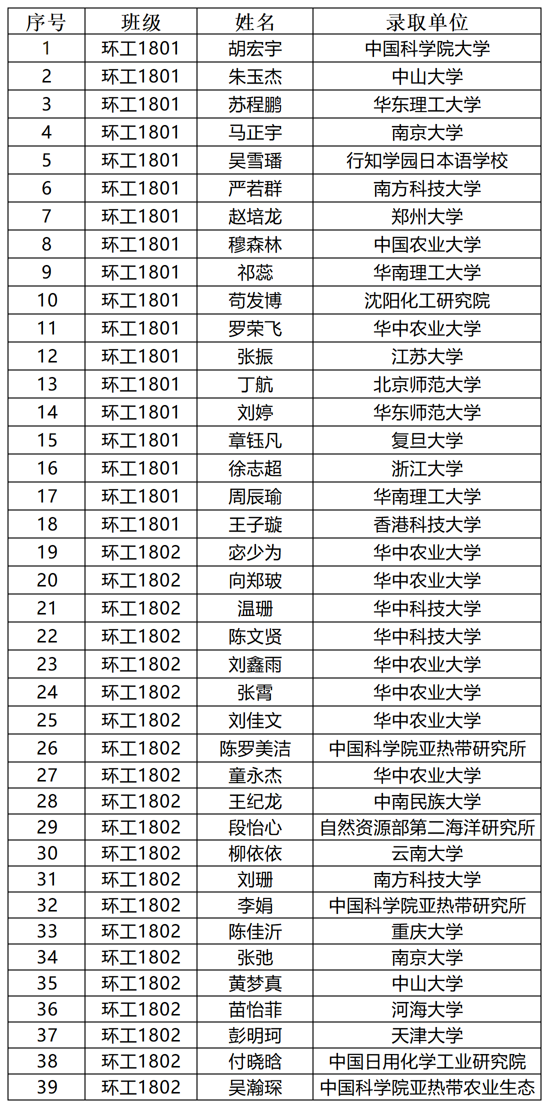 经统计,2018级本科生共计308人,其中升学人数176,占总人数的57.14%。其中环境工程专业共计39人升学。详情如下: